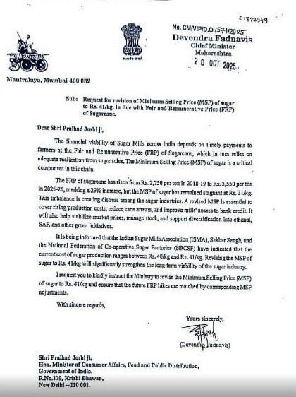 सन 2018-19 मध्ये उसाची एफआरपी 2,750 रुपये प्रतिटन हाेती, ती एफआरपी 2025-26च्या हंगामासाठी 3,550 रुपये प्रतिटन केली आहे. त्यामुळे साखरेचे किमान विक्री मूल्य 31 रुपये प्रतिकिलाेवरून 41 रुपये प्रतिकिलाे करण्याची मागणी या पत्राद्वारे मुख्यमंत्री देवेंद्र फडणवीस यांनी केंद्र सरकारच्या ग्राहक कल्याण व अन्न आणि सार्वजनिक वितरण मंत्रालयाकडे केली आहे. या किमान विक्री मूल्याचा अर्थ असा कारखानदारांना त्यांच्याडील साखर 31 रुपये प्रतिकिलाे दरापेक्षा कमी दरात विकता येत नाही. म्हणजे कारखानदारांना प्रतिकिलाे साखर 31 रुपयांपेक्षा अधिक दराने विकण्याची सरकारने अधिकृत परवानगी दिली आहे. आज खुल्या बाजारात साखरेचे किरकाेळ बाजारातील दर प्रतिकिलाे 47 ते 49 रुपये प्रतिकिलाे आहेत. तर कारखानदार 44 ते 48 रुपये प्रतिकिलाे दराने साखरेची विक्री करीत असताना त्यांना आता साखरेचे किमान विक्री मूल्य 41 रुपये प्रतिकिलाे करण्याची मागणी करीत आहेत. त्यामुळे साखरेचे किरकाेळ बाजारातील दर 52 ते 55 रुपये प्रतिकलाेवर जाण्याची शक्यता नाकारता येत नाही.
