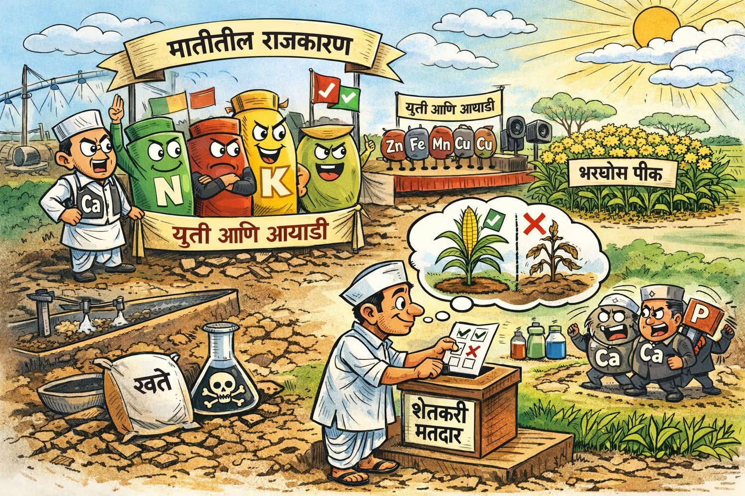 नायट्रोजन आणि पोटॅश यांची युती मात्र मजबूत आहे. दोघे एकत्र आले की सरकार स्थिर राहतं. वाढ होते, पण ती आडवी-तिडवी होत नाही. पिक उंच वाढतं, पण कोसळत नाही. म्हणूनच या युतीवर आधारित खतं वर्षानुवर्षे चालत आलेली आहेत. इथे संघर्ष नाही, सहमती आहे, निष्क्रियता नाही. ही जणू बहुमताचं सरकार असतं. पण जसं राजकारणात काही पक्ष एकत्र आले की गोंधळ होतो, तसंच फॉस्फरस आणि कॅल्शियम एकत्र आले की थेट संघर्ष होतो. हे दोघे कट्टर विरोधक आहेत. एकत्र आले की लगेचच अघुलनशील संयुग तयार होतं, म्हणजेच खत असूनही पिकाला काहीच मिळत नाही. शेतकरी म्हणतो, ‘सगळं दिलं, तरी पीक का चाललं नाही?’ कारण त्या सरकारमध्येच अंतर्गत युद्ध चालू असतं. कागदावर सरकार असतं, पण प्रत्यक्षात प्रशासन ठप्प झालेलं असतं.