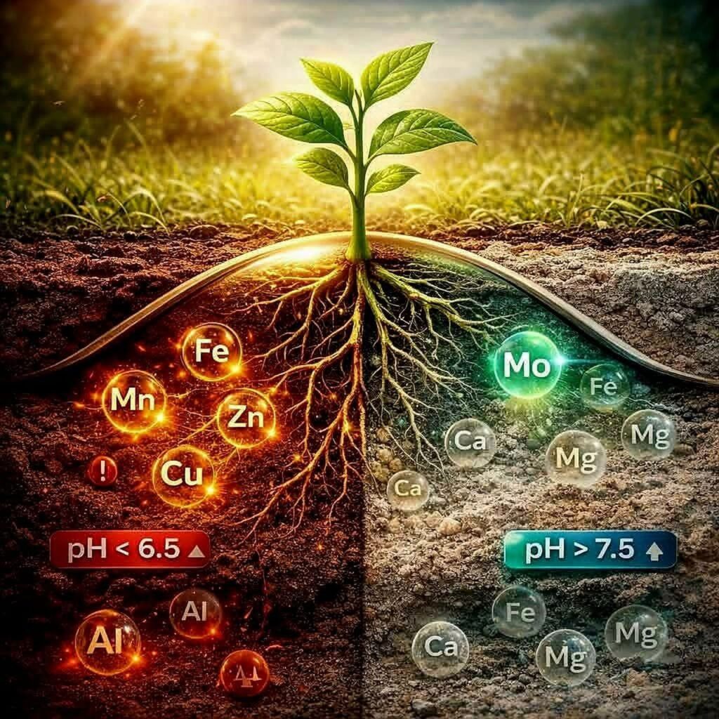 🔆 जमिनीत क्षारांचे प्रमाण अधिक असणे, सिंचनाच्या पाण्याचा अतिवापर करणे किंवा पाण्याची कमतरता भासणे, परस्पर विराेधी खते एकत्र मिसळून देणे, खतांचा अतिवापर, जमिनीतील सेंद्रिय पदार्थांची कमतरता, परस्पर विराेधी अन्नद्रव्ये यामुळे मातीच्या पीएचचा असमताेल निर्माण हाेताे.